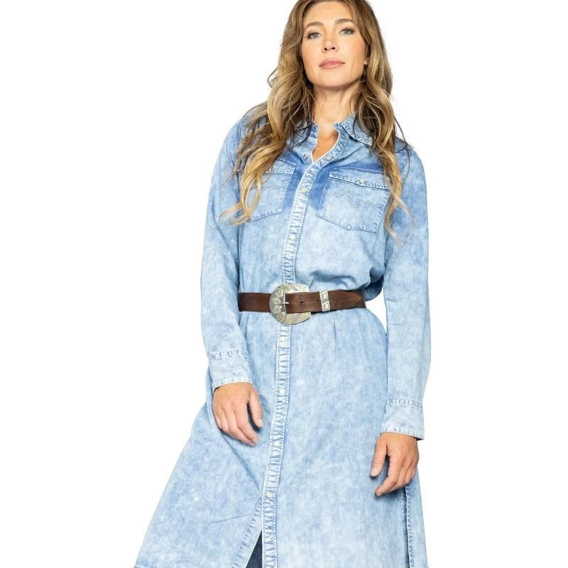 Details: Long Sleeve, Snap Front, Denim Look Dress