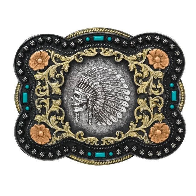 Nocona mens western buckle by M&F Western Products is full of color. It features a detailed Indian chief skull motif in the center of a rectangle buckle. There is an antique gold and copper floral scroll design around the motif with turquoise stones on the sides for a touch of western flair. The buckle is surrounded by a traditional rope and starburst dot trim for an authentic cowboy look.