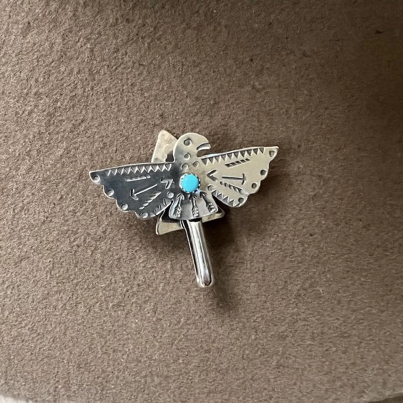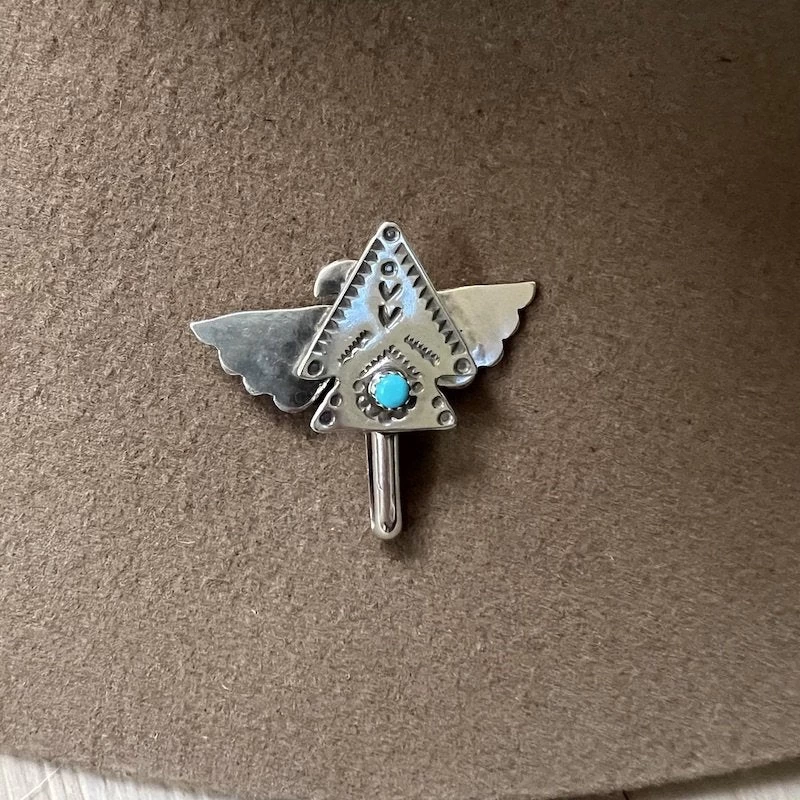 Made with genuine turquoise and .925 sterling silver. This reversible hat slider is the perfect way to give your hat some bling. One side is a full thunderbird design, and the flip side is an arrowhead. Wear on the front, back, or side of your hat brim.