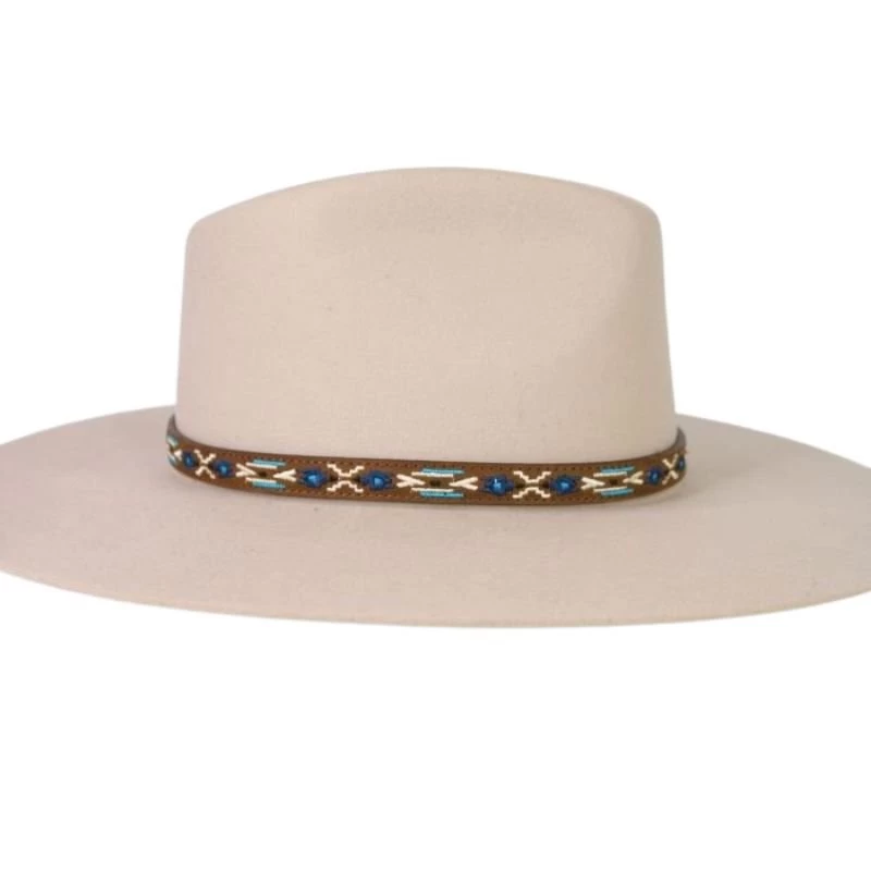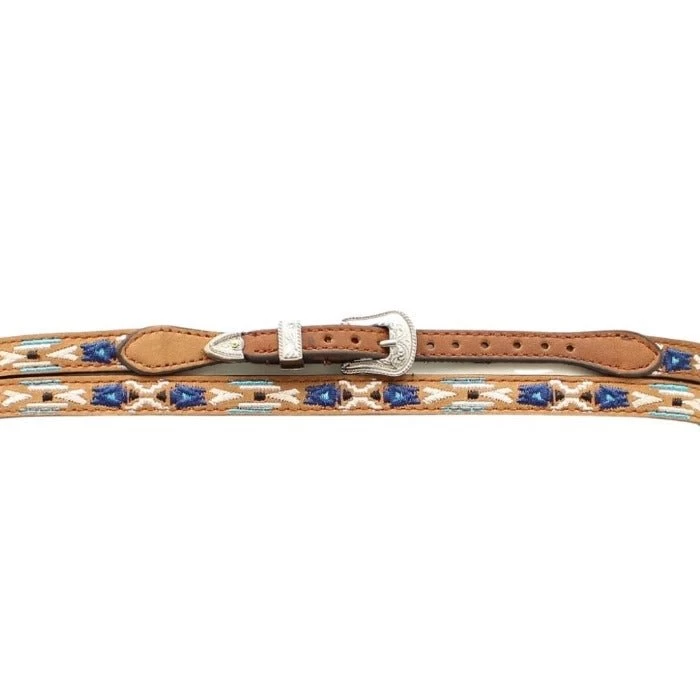 A great western hatband for the fashionable cowboy. This very unique hatband by M&F Western Products features a fancy embroidered aztec print. This style hatband uses a belt style adjustment with a rounded silver buckle.