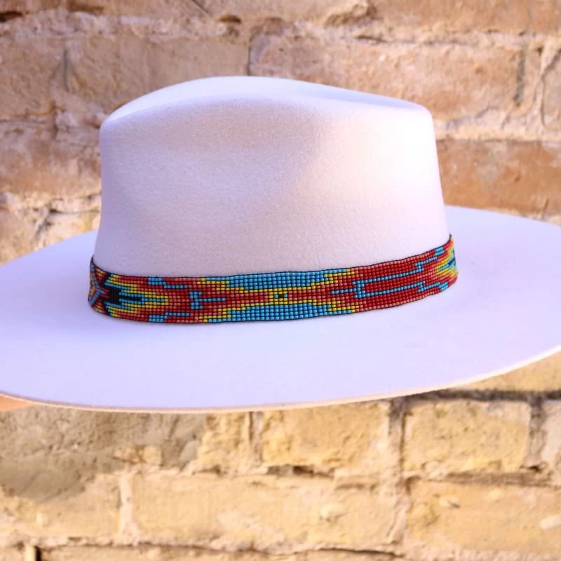 Dress up your favorite hat with this beaded hatband. Stretch to fit in a southwestern pattern of bright multicolored beads.